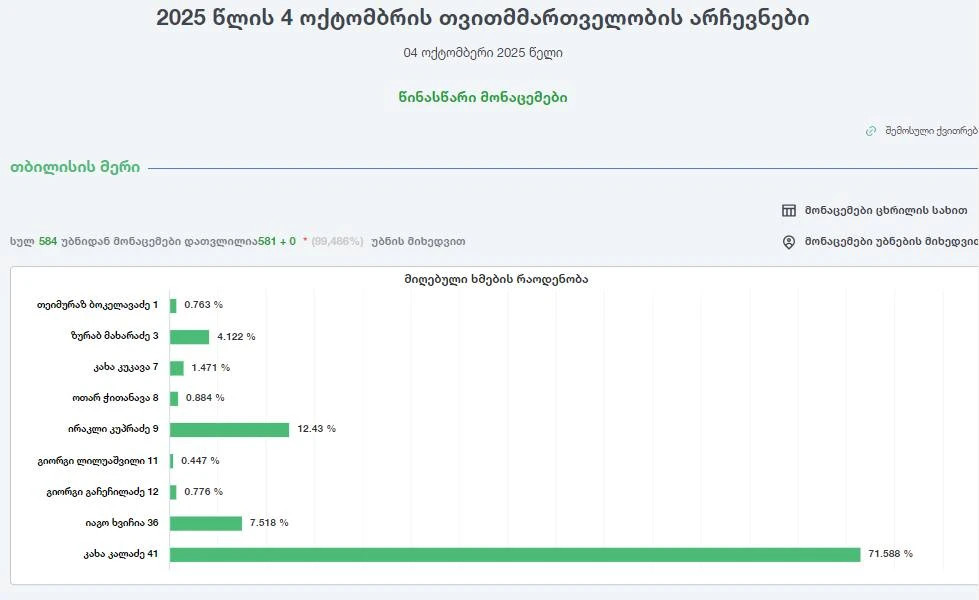ამ დროისთვის ცესკოს თბილისის მერის არჩევნებისთვის შექმნილი 584 უბნიდან 581-ის მონაცემები აქვს დათვლილი.