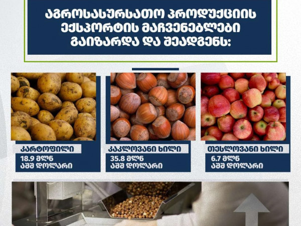 ამ მხრივ, უმსხვილესი საექსპორტო პარტნიორებია: რუსეთი (450.1 მლნ. აშშ დოლარი), თურქეთი (185.6 მლნ. აშშ დოლარი) და ჩინეთი (177.9 მლნ. აშშ დოლარი).