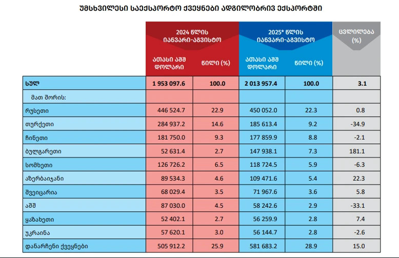 საქართველოს სტატისტიკის ეროვნული სამსახურის ინფორმაციით, 2025 წლის იანვარ-აგვისტოში ათი უმსხვილესი ქვეყნის წილმა საქართველოს მთლიან ადგილობრივ ექსპორტში 71.1 პროცენტი შეადგინა.