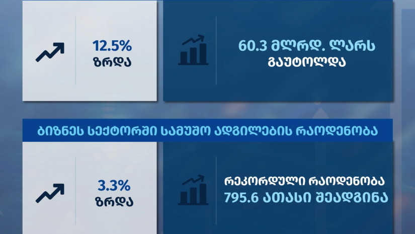 წელს ორი კვარტლის მონაცემების მიხედვით ბიზნეს სექტორის ბრუნვა 13.5%-ით გაიზარდა 116.3 მლრდ. ლარამდე, ხოლო ბიზნეს სექტორის გამოშვებამ 43.9 მლრდ. ლარი შეადგინა, რაც 14.2%-ით აღემატება წინა წლის შესაბამის პერიოდს.
