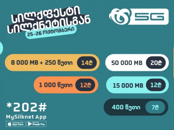 22 და 23 ნოემბერს, სილქნეტის აბონენტები გაიაქტიურებენ სილქფესტის შეთავაზებებს კოდით *202#, აპლიკაციით Mysilknet, ან პირდაპირ ვებ გვერდიდან: