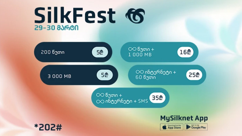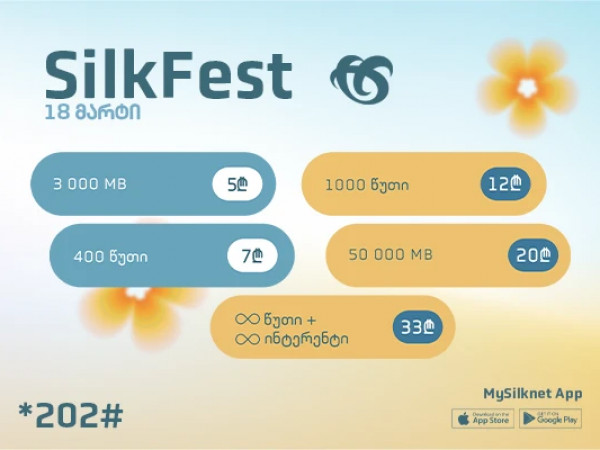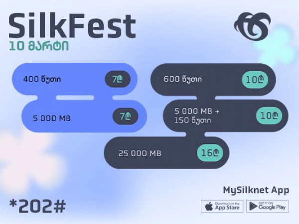 29-30 მარტს კოდით *202#, აპლიკაციით Mysilknet ან პირდაპირ საიტიდან, სილქნეტის აბონენტები სპეციალურ ფასად შეიძენენ შემდეგ პაკეტებს: