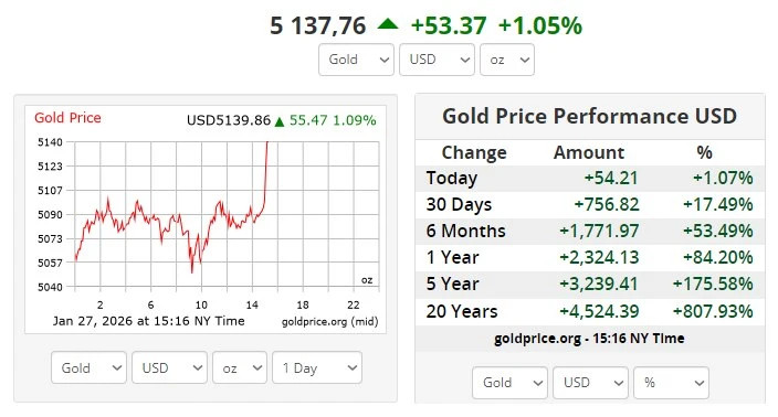 ამ დროისთვის (თბილისის დროით 00:15საათი) უნცია ოქროს ფასი 5137,76 დოლარია (გრამი 165,18 დოლარი).
