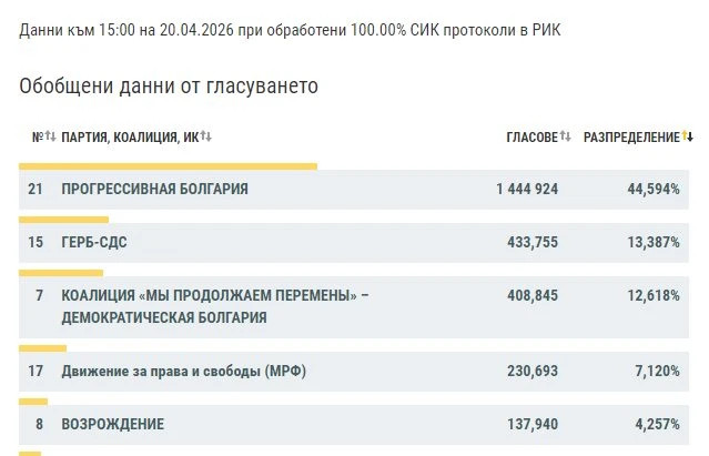 ბიულეტენების 100%-ის დათვლის შედეგად გაირკვა, რომ რუმენ რადევის „პროგრესული ბულგარეთს“ ამომრჩეველთა 44,594%-მა დაუჭირა მხარი.