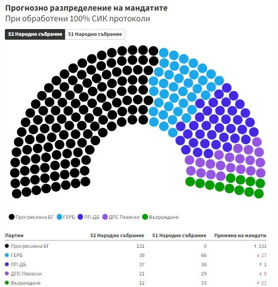 ბულგარეთის 240-ადგილიან პარლამენტში „პროგრესულ ბულგარეთს“ 131 დეპუტატი ეყოლება, მომდევნო ადგილებზე გასულებს კი, შესაბამისად, 39, 37, 21 და 12.