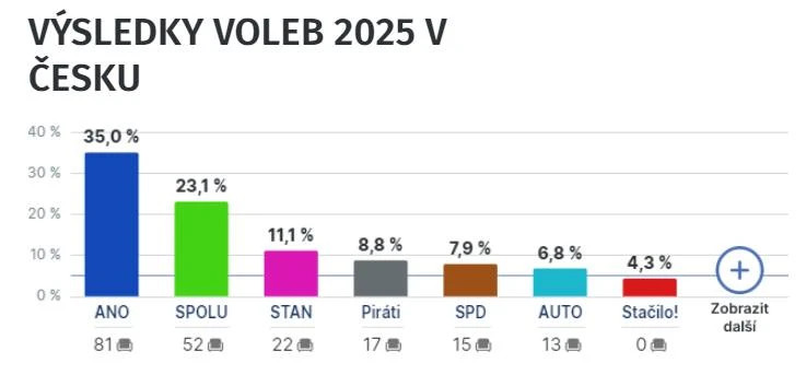 ჩეხეთში დასრულდა საპარლამენტო არჩევნებში ხმის მიცემის პროცედურა. ჩეხური მედიის მიერ გავრცელებული ინფორმაციით, ამ დროისთვის მიცემული ხმების დაახლოებით 90%-ია დაჯამებული, რის შედეგადაც ცნობილი გახდა, რომ ჩეხეთის ყოფილი პრემიერ-მინისტრის, ანდრეი ბაბიშის პარტია Ano (Akce nespokojených občanů - უკმაყოფილო მოქალაქეთა ქმედებები) დანამდვილებით იმარჯვებს, თუმცა პარლამენტში უმრავლესობის მოპოვებისთვის მას კოალიციის შექმნა დასჭირდება და ამისთვის ექვსიდან ერთ-ერთ გამარჯვებულ პარტიასთან, ევროსკეპტიკოსების „ავტომობილისტები თავიანთთვის“, კოალიციის შექმნა დასჭირდება.
