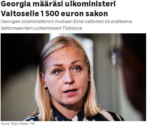 ეუთოს თავმჯდომარე და ფინეთის საგარეო საქმეთა მინისტრი ელინა ვალტონენი რუსთაველის გამზირზე გზის უკანონო გადაკეტვისთვის 5 000 ლარით დაჯარიმდა