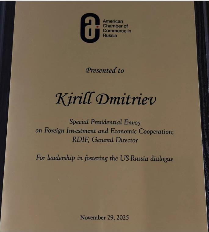 რუსეთის პრეზიდენტ ვლადიმერ პუტინის სპეციალური წარმომადგენელი კირილ დმიტრიევი აცხადებს, რომ „აშშ-სა და რუსეთს შორის დიალოგის ხელშეწყობის ლიდერობისთვის“ ამერიკის სავაჭრო პალატის ჯილდო მიიღო.