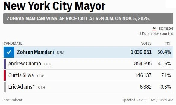განსხვავებით ვირჯინიისა და ნიუ-ჯერსის შტატებისა, სადაც ზომიერმა დემოკრატებმა გაიმარჯვეს, ნიუ-იორკის მერის არჩევნებში დემოკრატების სოციალისტურ იდეების მატარებელმა ზოჰრან რამდანიმ გაიმარჯვა.
