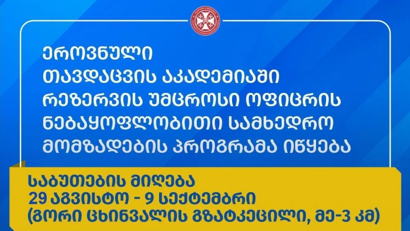 სამხედრო მომზადების პროგრამაზე საბუთების მიღება იწარმოებს 29 აგვისტოდან 9 სექტემბრის ჩათვლით, ქალაქ გორში, საქართველოს ეროვნული თავდაცვის აკადემიაში.