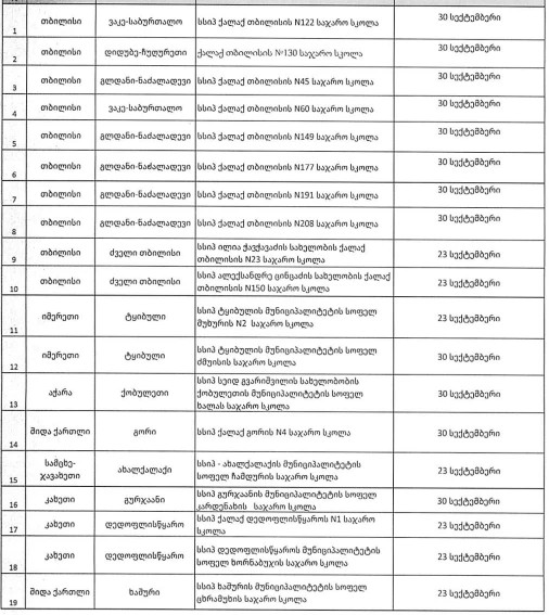 საქართველოს განათლების, მეცნიერების, კულტურისა და სპორტის მინისტრის მიხეილ ბატიაშვილის ბრძანების მიხედვით , სასწავლო პროცესი 16 სექტემბერს 19 საჯარო სკოლაში არ განახლდება.