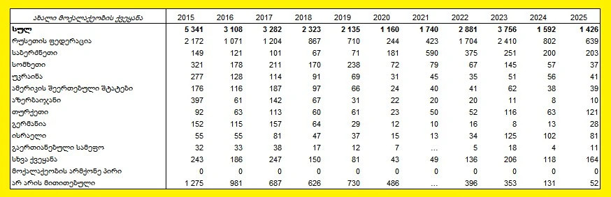 2025 წელს საქართველოს მოქალაქეობაშეწყვეტილ პირთა 44,9%-ის ახალი მოქალაქეობის ქვეყანა რუსეთია.