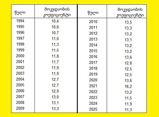 საქართველოს სტატისტიკის ეროვნულის სამსახურის მონაცემების თანახმად, მოკვდაობის ზოგადი კოეფიციენტის სიდიდე (გარდაცვლილთა რიცხოვნობა მოსახლეობის 1 000 კაცზე) 2025 წელს 11,3 იყო.