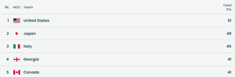 ქალთა და კაცთა თავისუფალი პროგრამით ასპარეზობის წინ საქართველოს 41 ქულა აქვს და მესამე ადგილზე გასვლის და ბრინჯაოს მედლის მოპოვების შანსს ინარჩუნებს.