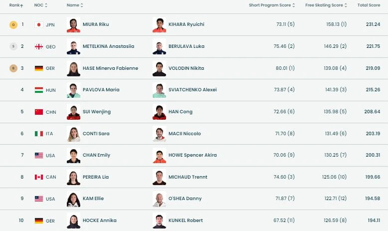 ანასტასია მეტელკინას და ლიკა ბერულავას წყვილმა თავისუფალი სტილით ასპარეზობაში 146,29 ქულა მიიღო და ადგილი დაიკავა.