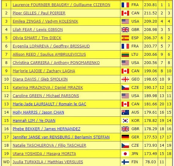დიანა დევისის და გლებ სმოლკინის წყვილმა, რომელიც რიტმული ცეკვების შემდეგ მე-10 ადგილს იკავებდა, თავისუფალი პროგრამით ასპარეზობაში 119,31 ქულა მიიღო და მე-9 ადგილი დაიკავა.